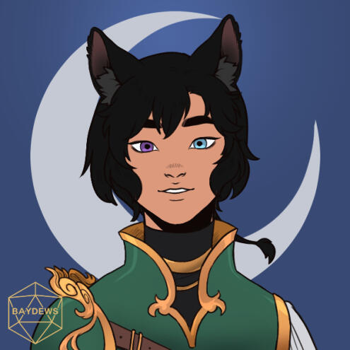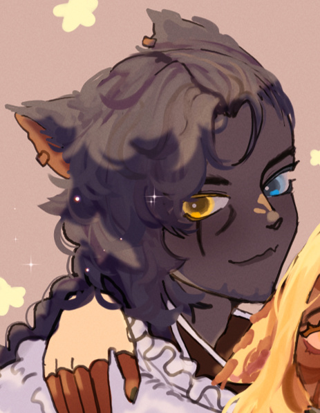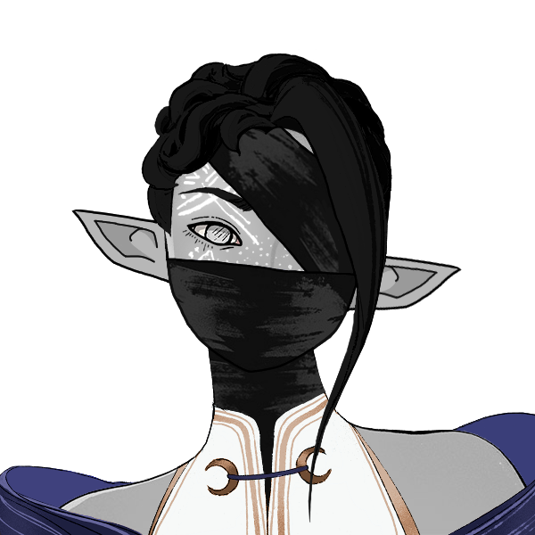 A peculiar and unusually tall Keeper of the Moon, Io measures at nearly 7 feet tall, rivaling even most au ra. But that's hardly where their quirks end—Io harbors a wonder for the world as if they first stepped foot on Etheirys's green earth yesterday. They'll tell you they're from a faraway land, though that's as much as they'll say.They carry no weapons and display no particular combat prowess, but claim they're nevertheless an adventurer and explorer. They wear an assortment of baubles and ornaments, and should one catch them in a shady enough place, their skin is covered in markings that only seem to appear under shadow. Even their cheeks bear little glowing dots they insist are just freckles, despite behaving the same as the celestial-themed tattoos(?) on their arms and legs.While Io is certainly odd, they're very friendly and extroverted. They enjoy exchanging words and stories, and they don't appear to harbor any malicious intentions even despite the air of mystery that shrouds them. Maybe they really are just a weird foreigner.Hooks!